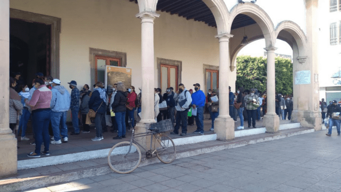 Personal de Presidencia Municipal organizaron a las personas para revisar sus documentos y recordarles las medidas sanitarias, pues la fila llegó hasta la calle Monterrey.