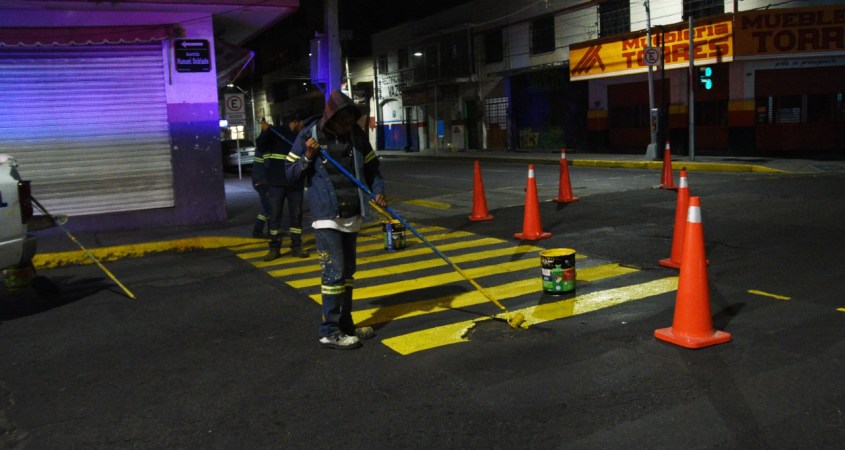 Para mantener una buena imagen en la ciudad, personal de la Dirección de Movilidad y Transporte, realiza trabajos de mantenimiento vial en cruces peatonales y avenidas de mayor afluencia.