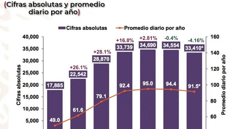 De acuerdo con los datos presentados por López Obrador, entre 2015 y 2016, durante el periodo de Enrique Peña Nieto, los homicidios incrementaron 26.1 por ciento; posteriormente, en 2017 subieron 28 por ciento; en 2018, 1.8 por ciento; en 2019; 2.81 por ciento.