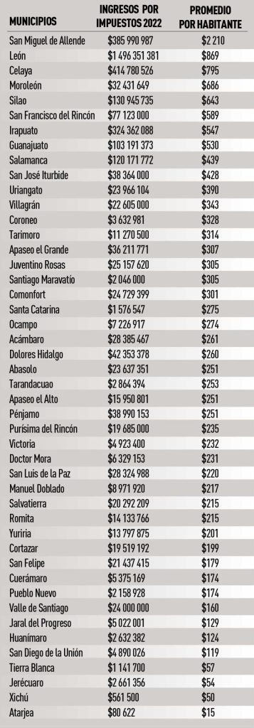 Es decir, que aunque la ciudad zapatera es la que proyecta la mayor recaudación en el presente ejercicio –más de mil 496 millones de pesos—, la contribución promedio por habitante es menos de la mitad en comparación con la de San Miguel de Allende.