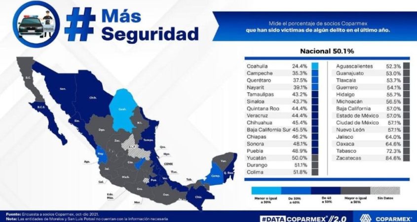 Mientras Coahuila fue el estado con menor incidencia, con el 24.4 por ciento; Zacatecas y Tabasco fueron donde más afiliados tuvieron algún incidente de inseguridad, con 84.6 y 72.3 por ciento, respectivamente.