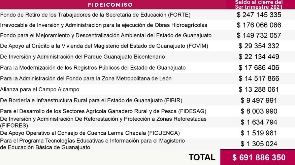 El único fideicomiso que se mantiene activo es el de la Zona Metropolitana de León, que abarca a los municipios de Silao, Purísima y San Francisco del Rincón, y el cual disponía de 14.5 millones de pesos al cierre del tercer trimestre de 2021.