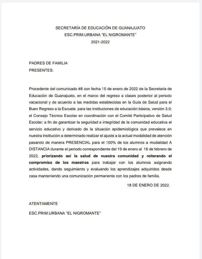 “Estamos muy molestos con la situación que está ocurriendo en la primaria. Resulta que el lunes pasado se tomó el acuerdo en el consejo técnico y comité de salud de regresar a la modalidad presencial hasta el 16 de febrero debido a los contagios que se han presentado en la escuela y sobre todo para proteger la salud de los niños que no cuentan ni con una dosis de protección anti coronavirus”, señalaron los padres de familia de la primaria El Nigromante.