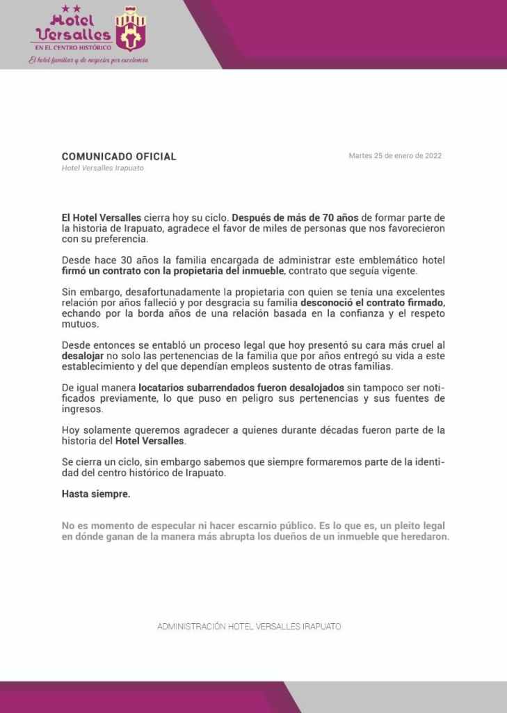 Más tarde el hotel emitió un comunicado en el que informaron que el contrato firmado entre la familia encargada de la administración y la propietaria del inmueble fue desconocido por la familia de esta última tras 30 años del pacto.