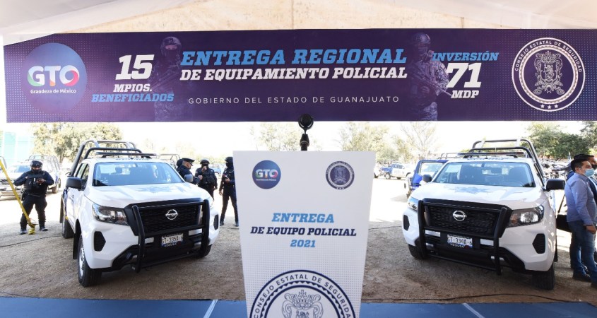 Irapuato recibió 11 camionetas, 13 cascos balístico, cuatro radios y 12 chalecos, con un monto total de inversión de nueve millones 205 mil pesos.