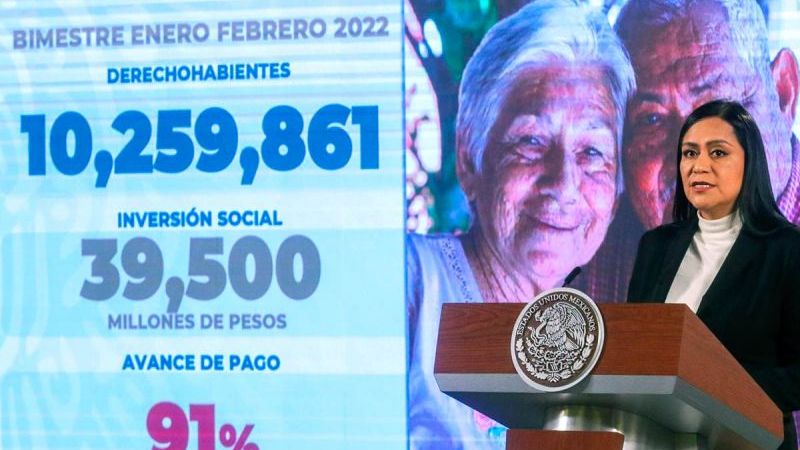 «Para este 31 de enero llegamos a la meta de 10 millones 259 mil adultos mayores incorporados a la pensión, como fue el compromiso del señor presidente. El pago de este bimestre enero-febrero se acaba de pagar en el mes de enero, son más de diez millones de adultos mayores; la inversión para el bimestre son 39 mil 500 millones y llevamos un avance en el pago del 91 por ciento», precisó en su informe la secretaria.