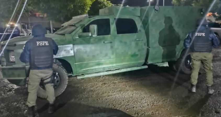 Una vez ubicado, por tierra elementos de la SSPE y de la FGE, en coordinación con el Ejército Mexicano y la Guardia Nacional, aseguraron: una camioneta marca Ram, tipo pick Up, color verde/negro (pixelada con blindaje artesanal), sin tablillas de circulación.
