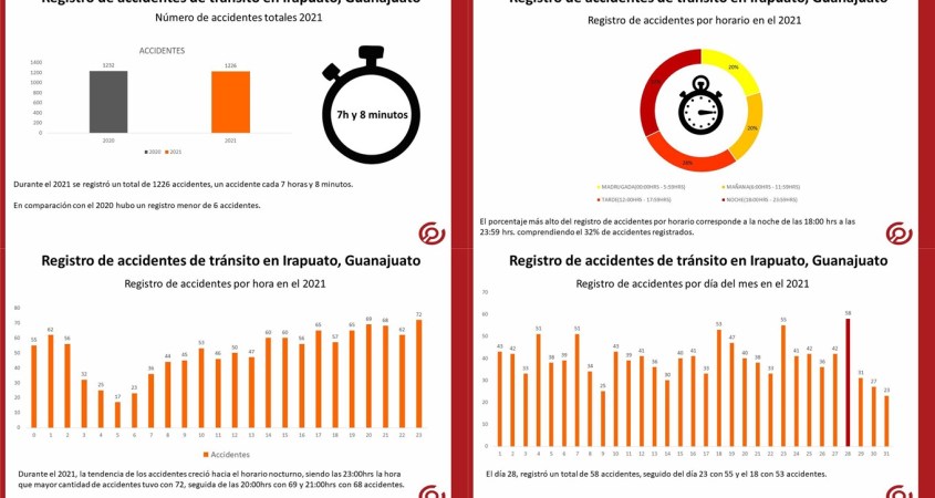 Durante el 2021 se registró un total de 1226 accidentes de tránsito en la zona urbana, esta información brindada por la Dirección de tránsito y movilidad del municipio de Irapuato a través de solicitudes de acceso a la información pública.