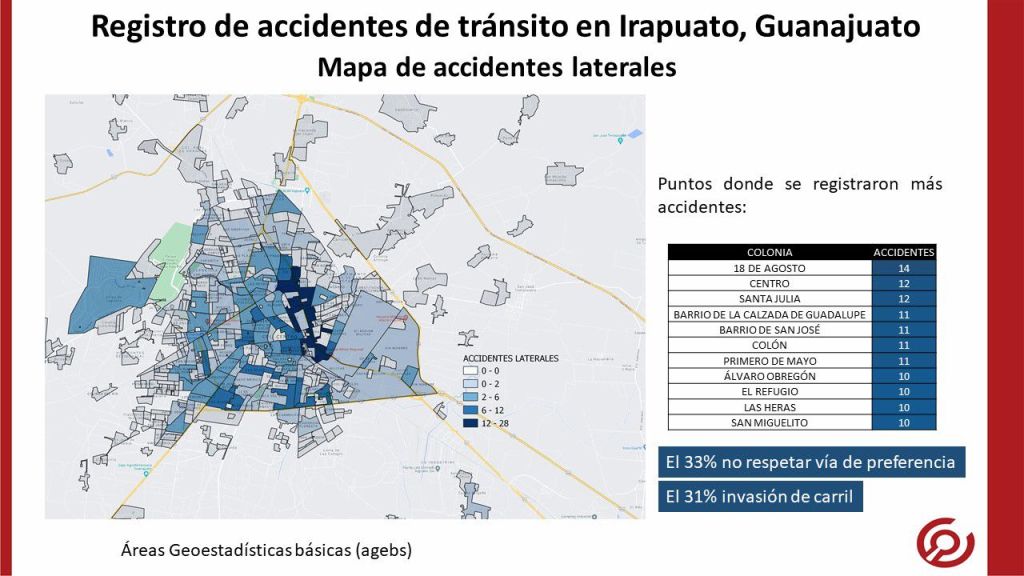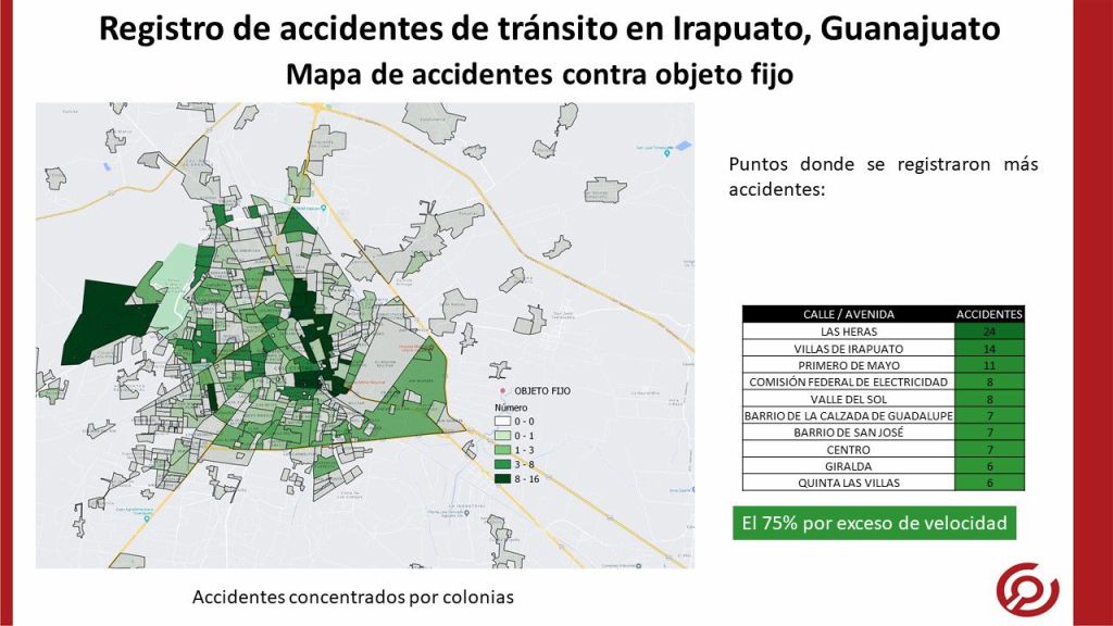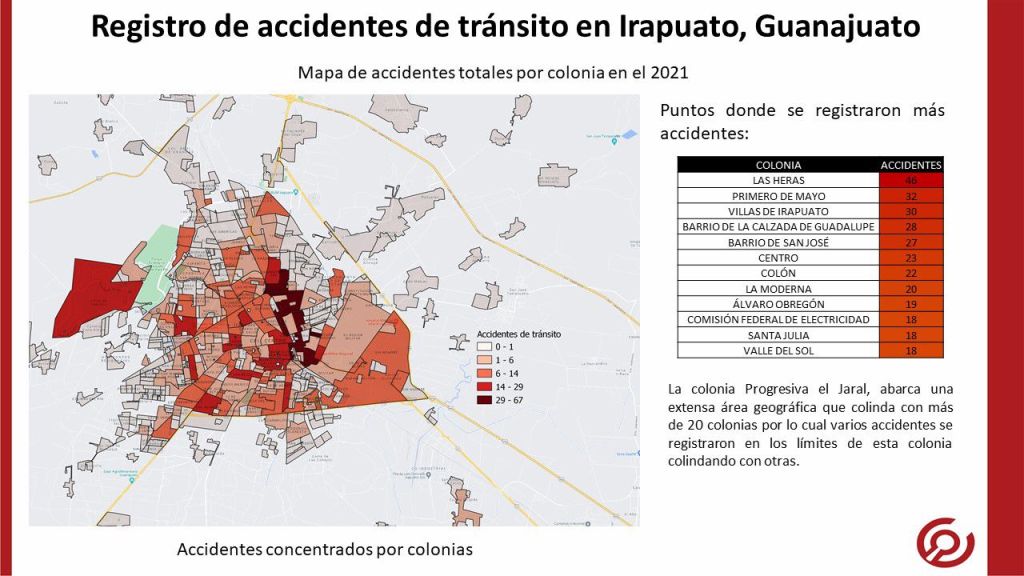 En lo que respecta a colonias, las 5 colonias con mayor registro de accidentes fueron: Las Heras con 46, Primero de Mayo con 32, Villas de Irapuato con 30, Barrio de la calzada de Guadalupe con 28, Barrio de San José con 27.