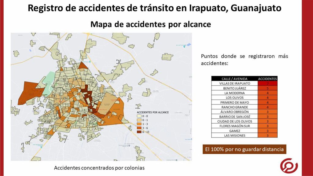 2.-Por alcance que representó el 11%, la causa total de este accidente fue no guardar distancia. Las 3 colonias que registraron mayor cantidad de accidentes de este tipo fueron Villas de Irapuato, Benito Juárez y la Moderna.