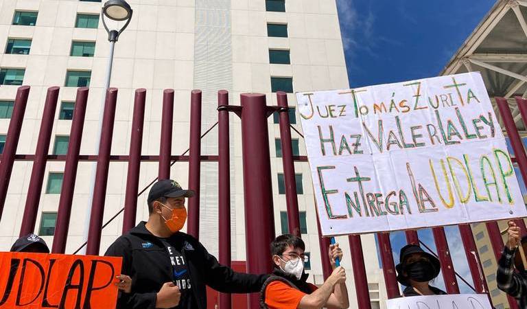 Con pancartas en donde se leían consignas como “Juez Tomás Zurita haz valer la ley, entrega la UDLAP”, “Queremos nuestro campus legalmente” y “Juez 3ro de distrito, amparo 1029/ 21, entrega la UDLAP”, al menos 40 estudiantes pidieron que las instalaciones se devuelvan formalmente para poder retomar actividades presenciales.