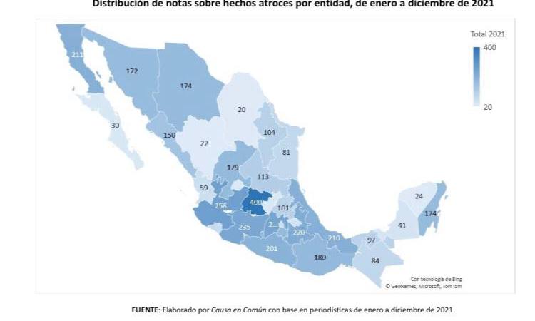 Con ello, fue la entidad que registró más casos, y la segunda con más víctimas, solo por debajo de Veracruz, en donde hubo 827. Sin embargo, en ambos casos hubo una disminución en comparación con el 2020, cuando fueron contabilizadas 566 atrocidades con 1 mil 002 víctimas en la entidad.