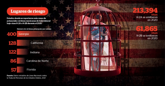 “Solo en el 2020, la NHTH detectó 886 potenciales víctimas de trata laboral de origen mexicano con visas de trabajo temporal, siendo el país con el número más alto de víctimas reportadas trabajando bajo estas visas”.
