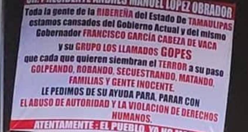 “Sr. presidente Andrés Manuel López Obrador. Toda la gente de la Ribereña del estado de Tamaulipas estamos cansados del gobierno actual y del mismo gobernador Francisco Javier García Cabeza de Vaca y su grupo los llamados GOPES que cada que quieren siembran el terror a su paso, golpeando robando, secuestrando, matando familias y gente inocente. Le pedimos de su ayuda para acabar con el abuso de autoridad y la violación de derechos humanos. Atentamente el Pueblo, ya no más…”, se leía.
