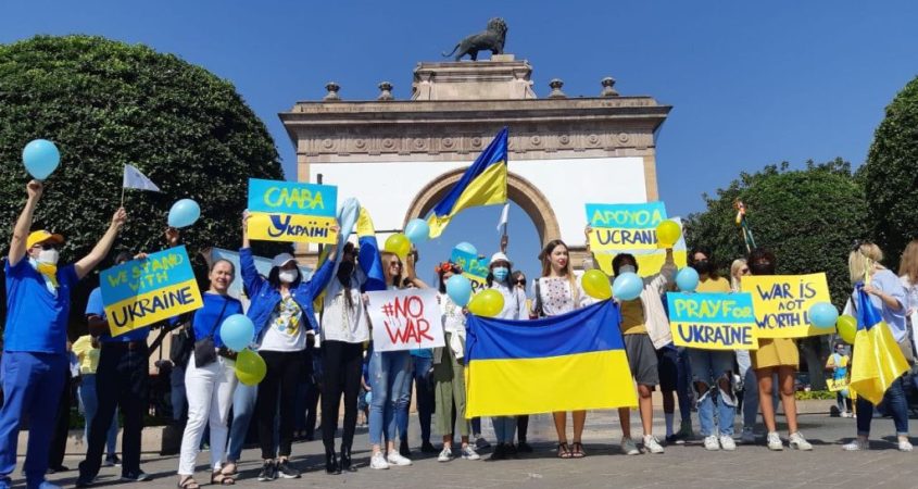 Cerca de 50 ucranianos se reunieron en el Arco de la Calzada donde entonaron su himno y luego marcharon por la calle Madero mostrando pancartas en las que se leían mensajes de paz y repudio a la guerra en su país.