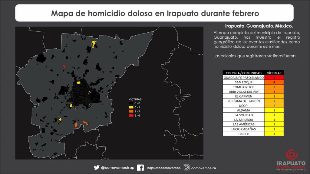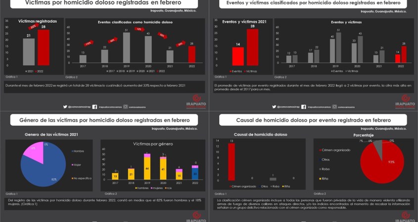 El reporte mensual de víctimas por homicidio doloso presenta la información condensada del registro de víctimas y eventos acontecidos en el municipio de Irapuato, Guanajuato.