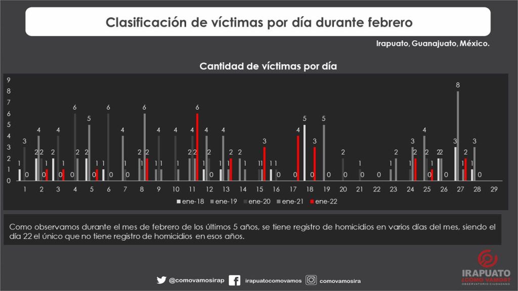 Durante febrero 2022 acorde a nuestro registro de víctimas por homicidio doloso existió recuento de 14 eventos donde en promedio fallecieron 2 personas en cada evento por un total de 28 víctimas.