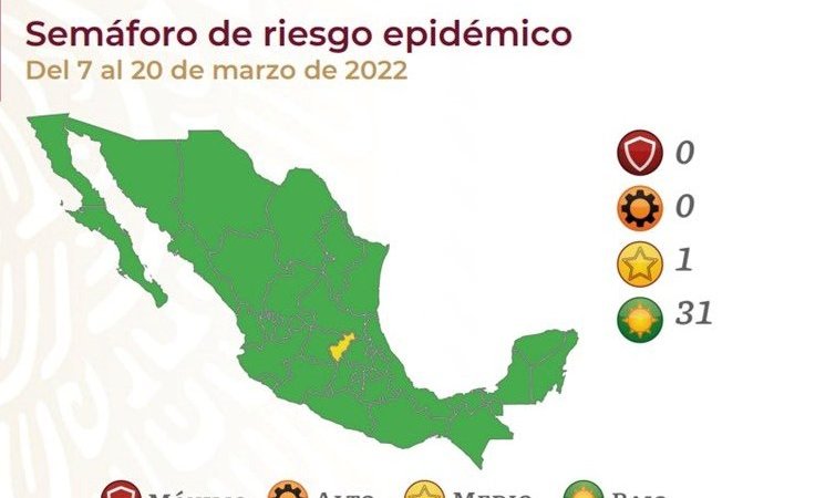“En este periodo estarán en verde: Aguascalientes, Baja California, Baja California Sur, Campeche, Chiapas, Chihuahua, Ciudad de México, Coahuila, Colima, Durango, Estado de México, Guanajuato, Guerrero, Hidalgo, Jalisco, Michoacán, Morelos, Nayarit, Nuevo León, Oaxaca, Puebla, Quintana Roo, San Luis Potosí, Sinaloa, Sonora, Tabasco, Tamaulipas, Tlaxcala, Veracruz, Yucatán y Zacatecas; en amarillo: Querétaro”, señaló la institución.