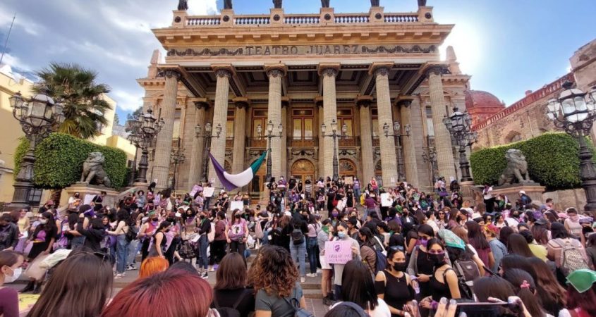 Del Teatro Juárez el contingente marchó hasta la Alhóndiga de Granaditas, en donde leyeron un posicionamiento sobre la situación de las mujeres en la entidad y como la pandemia por el COVID-19 agravó situación como la violencia, el trabajo no remunerado (tareas domésticas) y otros aspectos.