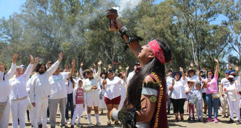 Luego, el Chamán Julián,de la Casa del Venado Azul, encabezó el ceremonial y ofrenda al Dios del Sol. Primero, un momento para pedir perdón y agradecer a los cuatro elementos —tierra, aire, agua y fuego— por permitir el uso del espacio. Luego, agradeció a la Madre Tierra “por permitirnos la vida”.
