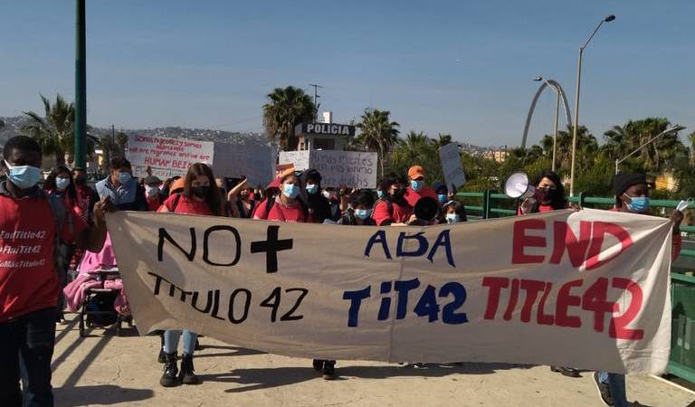Migrantes caminaron desde el Puente México hacia la garita internacional para acompañar a una docena de solicitantes de asilo y exigir a Estados Unidos que termine con el título 42, implementado por Donald Trump, para expulsar sin trámites a la población extranjera que pide protección en los cruces internacionales.