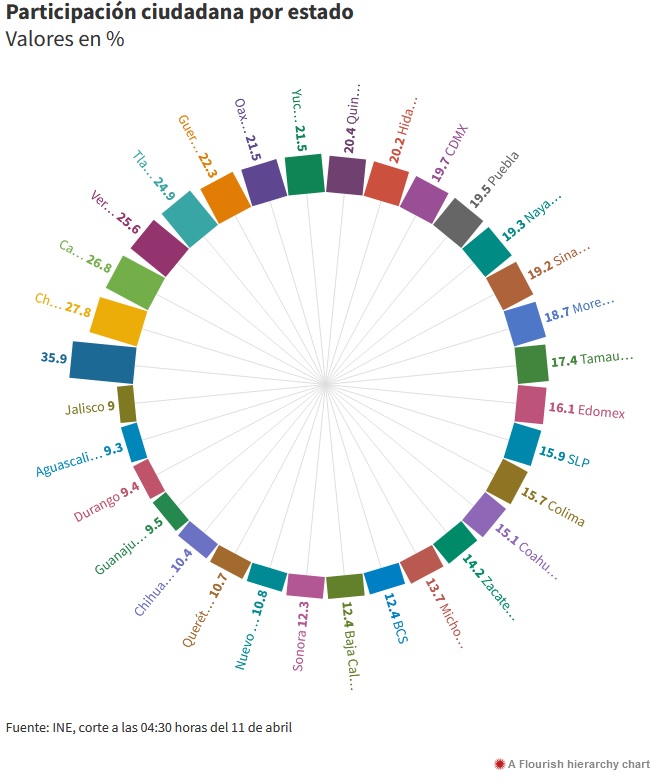 Del otro lado de la moneda, cuatro entidades bajo mandato de Movimiento Regeneración Nacional (Morena) encabezan la lista con más del 25% de participación: Veracruz, con 25.60%; Campeche, con 26.80%; Chiapas, con 27, y Tabasco con 35.90%.