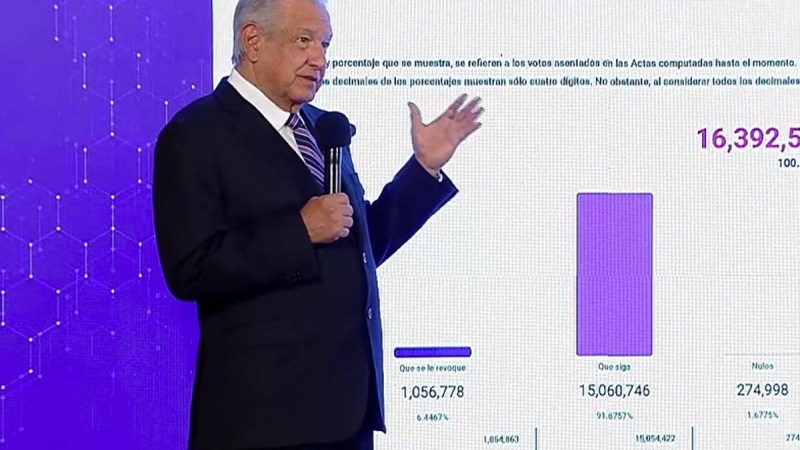 En conferencia en Palacio Nacional, el mandatario destacó que, con el 99.32 por ciento de las casillas computadas, de los 16 millones 392 mil 522 votos registrados en la consulta de revocación de mandato, 15 millones 60 mil 746 fueron para que siga en el cargo; es decir, 143 mil 819 más que los que obtuvieron en 2006 Felipe Calderón y el PAN.