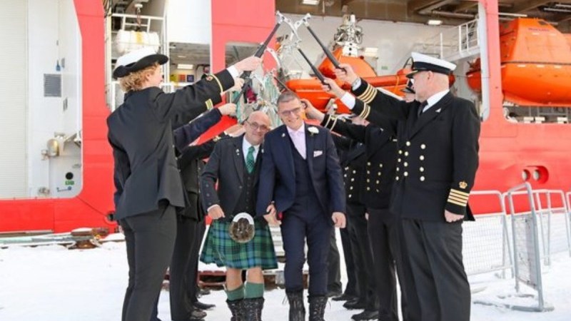 La ceremonia -segundo matrimonio entre personal del BAS desde que un cambio en la ley en 2016 permitió celebrar matrimonios en los sectores antárticos cuya soberanía reclama Reino Unido-, fue oficiada por el capitán del barco polar «RRS Sir David Attenborough».