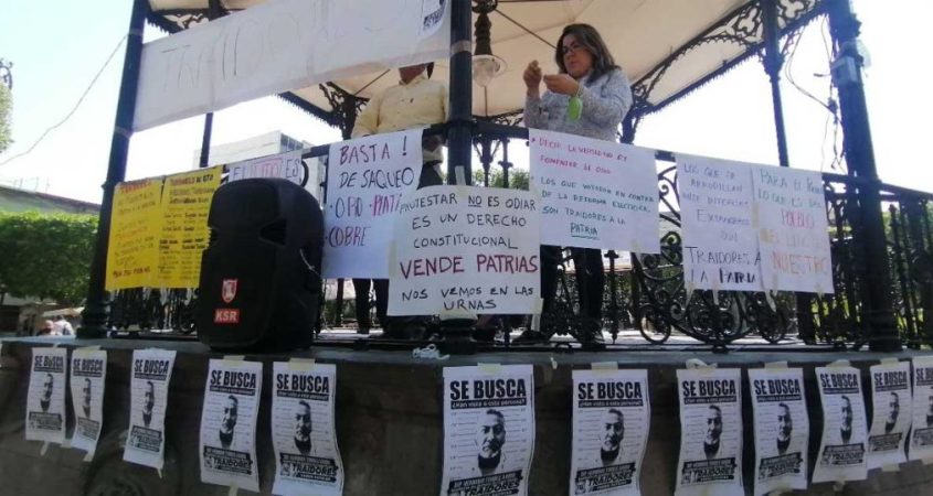 Poco más de una veintena de ciudadanos se congregaron en las inmediaciones del kiosco del jardín y colocaron cárteles con la foto de Herminio Torres. Cada una lo señala como traidor a la patria y las pancartas lo sentencian: “hasta aquí llegó tu carrera política corrupta”.