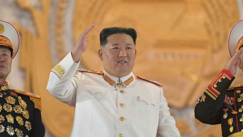 La agencia KCNA indicó que Kim supervisó un enorme desfile militar el lunes con paracaidistas, miles de soldados marchando y la exhibición de sus armas más grandes y potentes.
