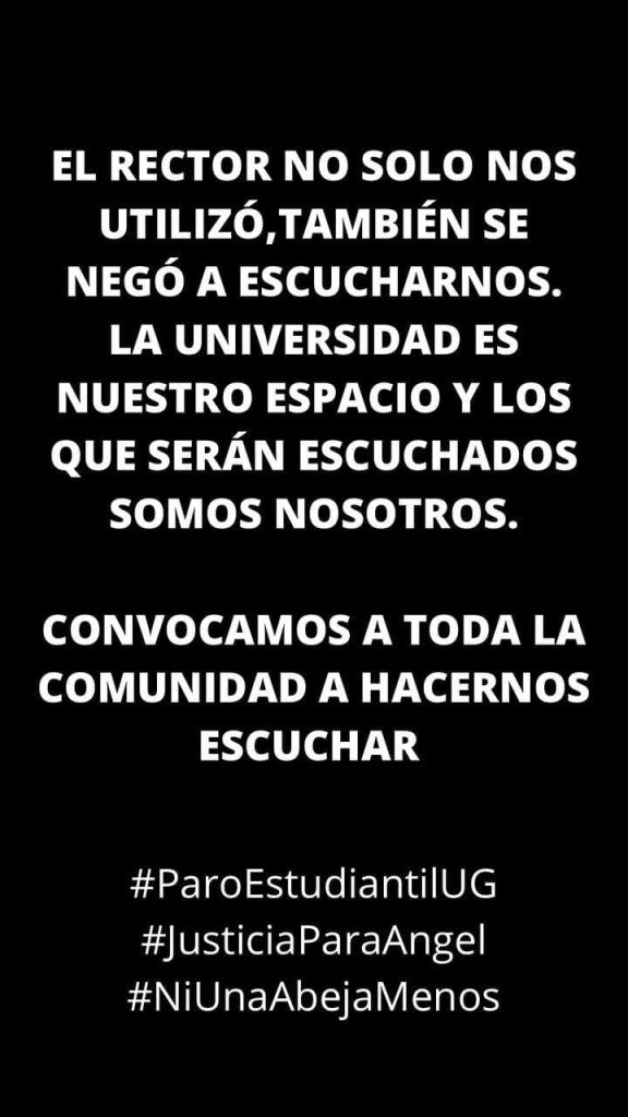 Ya durante el evento que poco a poco comenzó a crecer, en parte gracias al transporte que brindó la UG a otros campus, pero también bajo la legítima demanda estudiantil. Ellos, pidieron que ni el rector Luis Felipe Guerrero Agripino ni los directores de campus ‘se cuelguen’ del movimiento estudiantil para exigir justicia por la muerte de Ángel Yael.