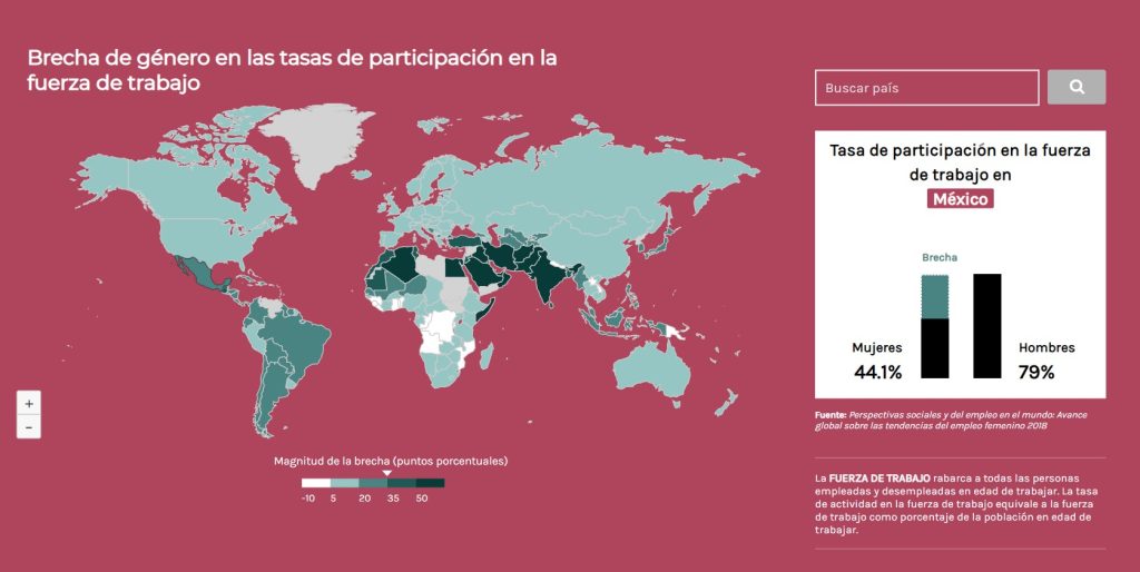 Según los datos de la OIT, hasta 2018 el país mostraba una brecha de 34.9% entre mujeres (44.1%) y hombres (79%).