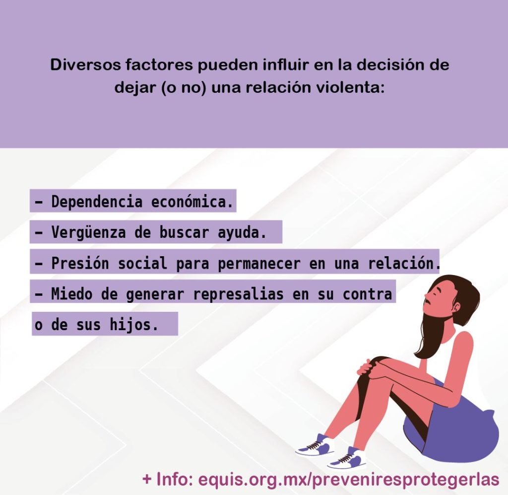 Pero, ¿por qué las víctimas optan por no dejar la relación? A decir de la organización civil Equis para las mujeres víctimas de violencia la decisión no es fácil. Hacerlo implica muchas transformaciones económicas, geográficas, psicológicas, entre otras.