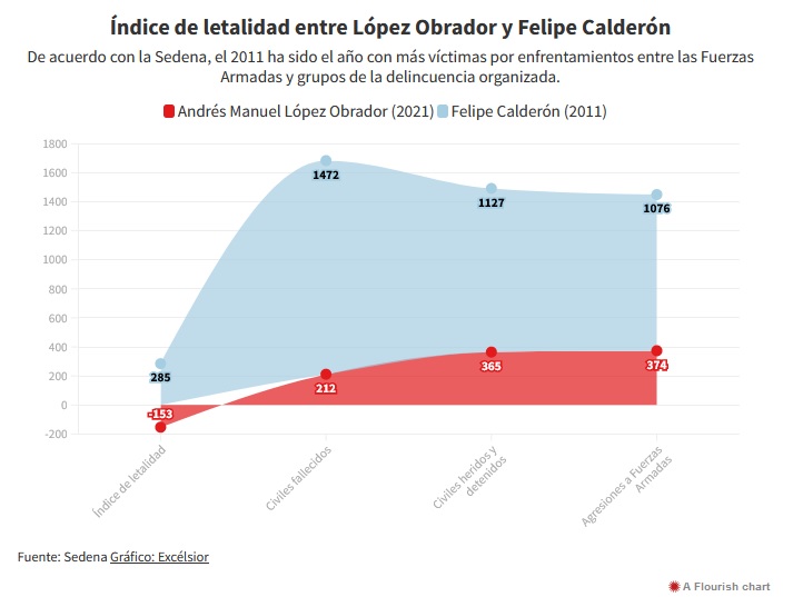 De acuerdo con información de la Secretaría de la Defensa Nacional (Sedena), mientras en 2011, el punto más alto de los registros de letalidad fue de 285, en 2021 este rubro fue de -153.