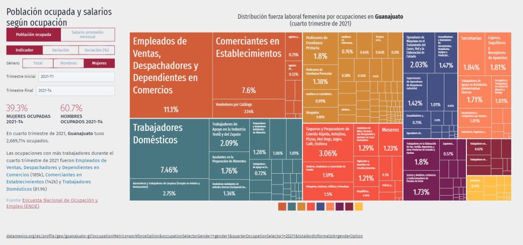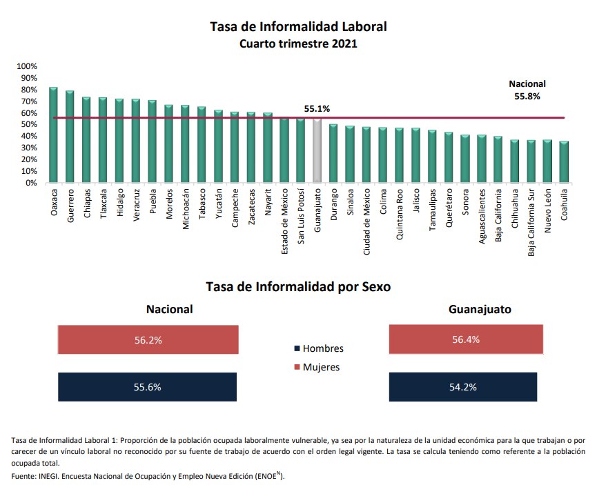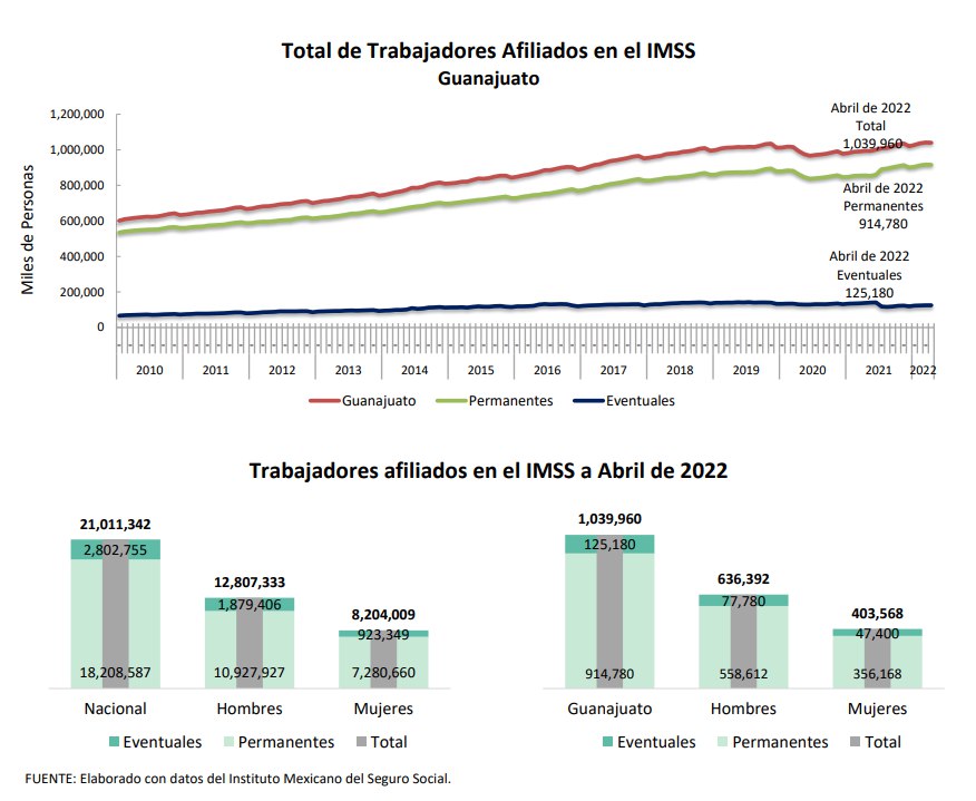 Por otro lado, para abril de 2022 en Guanajuato, el Instituto Mexicano del Seguro Social informó habría un millón 39 mil 960 de trabajadores afiliados, de los cuales 636 mil 392 eran hombres y 403 mil 568 mujeres, de las que 47 mil 400 serían afiliaciones eventuales.