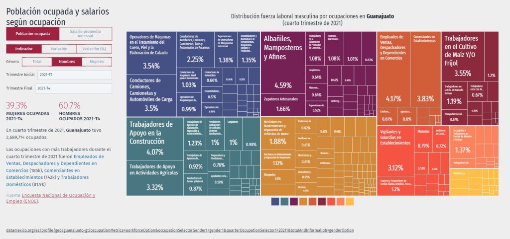 Para el cuarto trimestre de 2021, de acuerdo con la Encuesta Nacional de Ocupación y Empleo (ENOE) de INEGI, nuestra entidad tenía una PEA de 2 millones 799 mil 197. De ésta, casi 60% eran hombres ocupados y 40% mujeres; básicamente más de 1 millón 632 mil hombres contra poco más de 1 millón 57 mil mujeres.