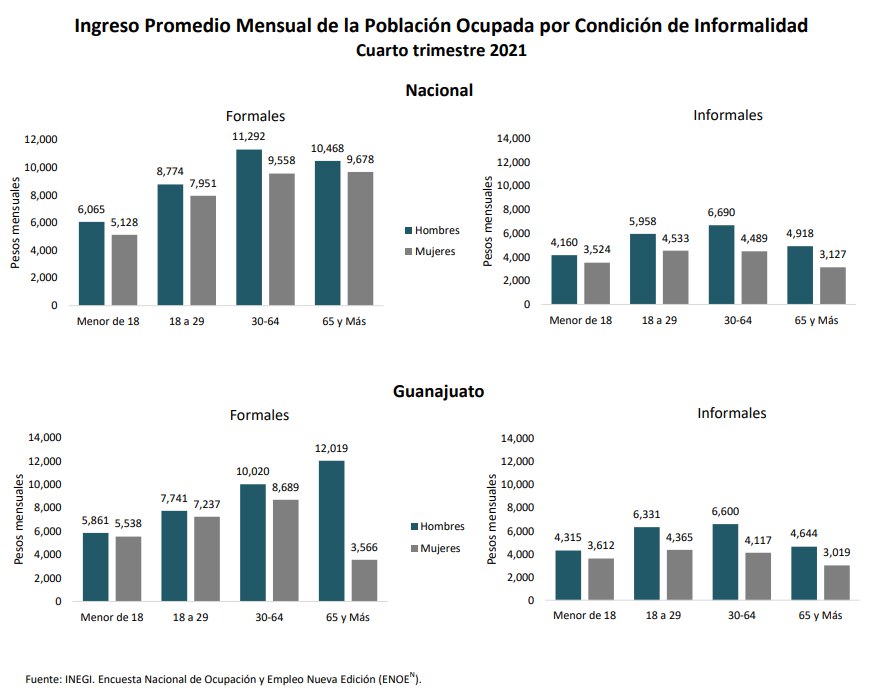 Además, si se observa el promedio mensual de ingresos por condición laboral y edad, dicha situación se amplía. Tanto en el sector formal como en el informal, Guanajuato presenta una diferencia promedio de más de mil pesos de ingresos mensuales entre hombres y mujeres. Mientas un hombre de 30 a 64 años en el sector formal gana más de 10 mil pesos, una mujer poco más de 8 mil. Aunque a nivel nacional dicha cifra es aún mayor.
