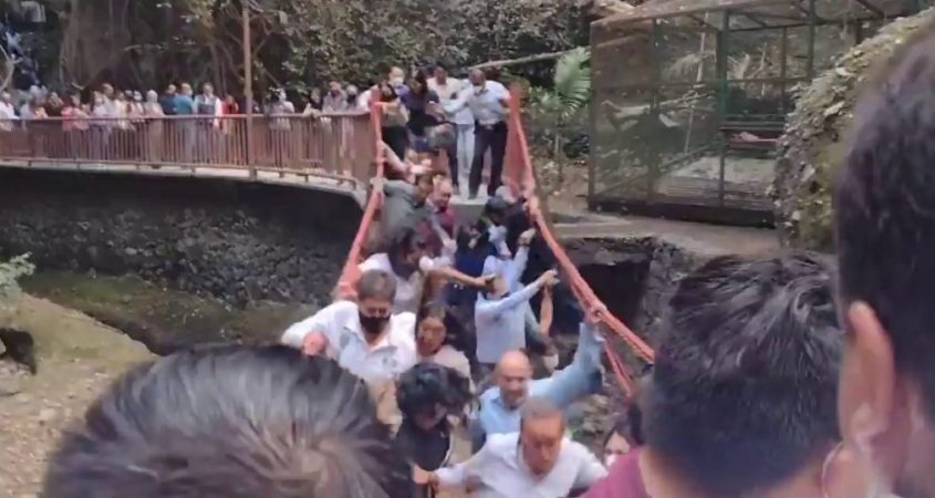 Durante la reinauguración del paso Ribereño en Amanalco, Morelos, un puente colgante de madera que se rompió justo cuando las autoridades realizaban el recorrido.