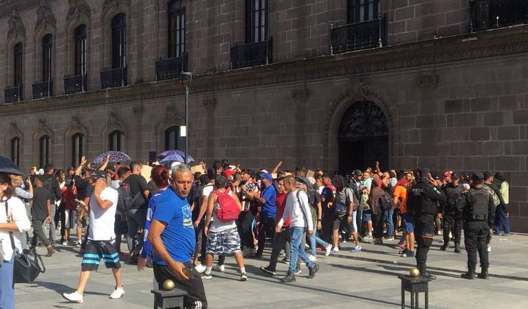 Ellos salieron de la central camionera donde se han ubicado desde que llegaron de Coahuila, donde no fueron aceptados y sus autobuses desviados a esta ciudad. Caminaron unos tres kilómetros para llegar hasta el palacio de Gobierno estatal, en su parte posterior donde han exigido que se les deje ir libremente.