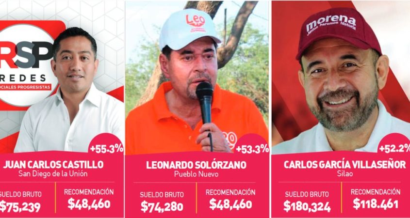 Así mismo, en esta condición están los alcaldes de San Diego de la Unión y Tierra Blanca, Juan Carlos Castillo Cantero y Rómulo García Cabrera, respectivamente, y quienes perciben 26 mil 779 y 21 mil 185 pesos más de lo sugerido por el Poder Legislativo.