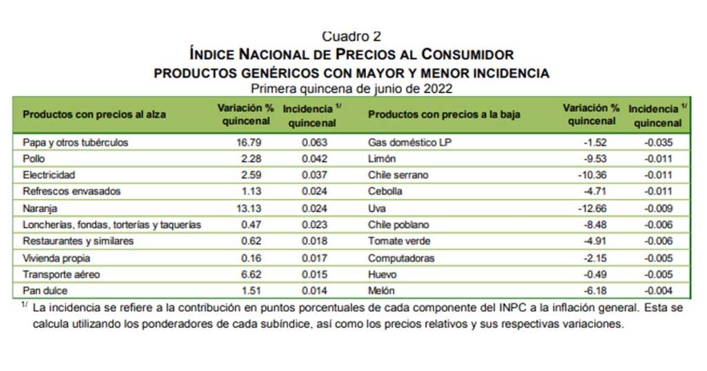 Destacan entre los productos con mayores precios al alza la papa y otros tubérculos, así como el pollo, los refrescos envasados y la Naranja. En tanto, entre los servicios más altos destaca la electricidad, las loncherías, fondas o torterías, y los restaurantes.