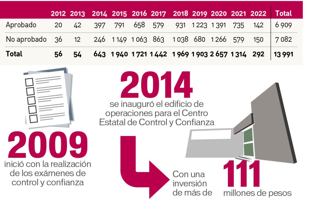 Mediante una solicitud de acceso a la información pública, Correo pudo conocer que, desde el 2010 y hasta el actual 2022 se han aplicado 13 mil 991 pruebas a personas interesadas en ocupar un puesto en la SSPE. De ésta, sólo 6 mil 909 aprobaron (el 49.3%) y en el resto se rechazó la posibilidad de ingreso del aspirante.