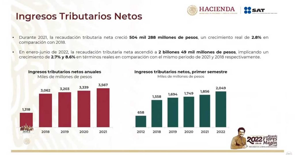 Según datos del SAT, en 2021 la recaudación tributaria creció 504 mil 288 millones de pesos, un aumento real de 2.8% si se compara con 2018. En ese sentido, de enero a junio, la recaudación tributaria ascendió a 2 billones 49 mil millones de pesos.