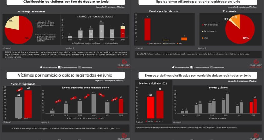 El reporte mensual de víctimas por homicidio doloso presenta la información condensada del registro de víctimas y eventos acontecidos en el municipio de Irapuato, Guanajuato.