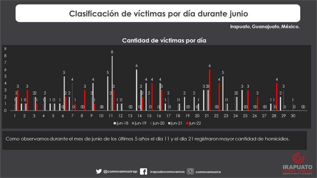 Durante junio 2022 acorde a nuestro registro de víctimas por homicidio doloso existió recuento de 35 eventos donde se registró un total de 45 víctimas.