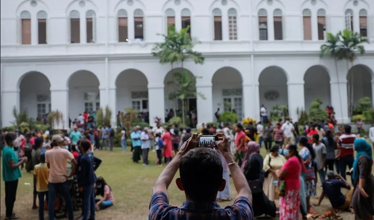 Cientos de miles de personas se congregaron en la capital, Colombo, para exigir que Rajapaksa asuma su responsabilidad por la escasez de medicinas, comida y combustible que llevaron a un país relativamente próspero al caos.