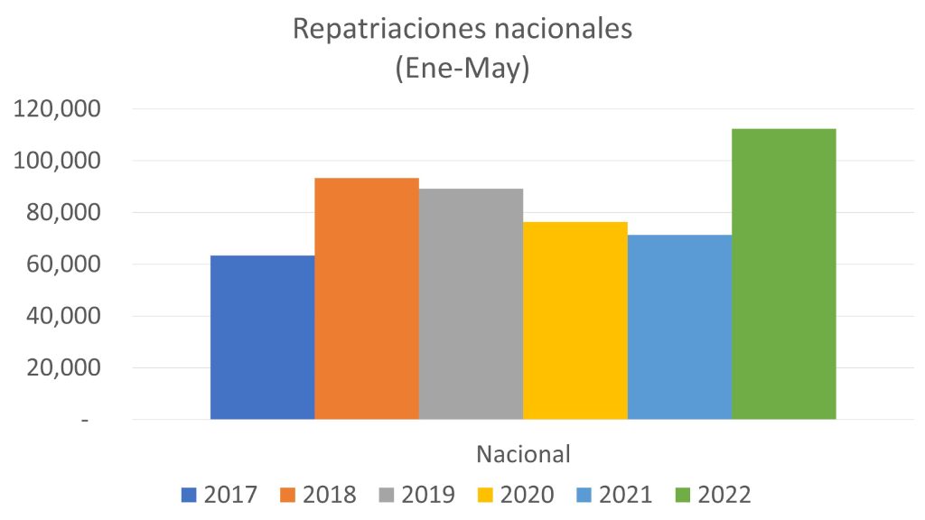 En comparación con el mismo periodo de años pasados, la entidad ha mostrado un aumento general del 14.59% respecto 2021. Por ejemplo, pasó de 6 mil 51 en 2021 a 6 mil 934 para 2022. Sin embargo, durante 2020, tuvo el retorno de 6 mil 857; 6 mil 571 para 2019; 6 mil 542 para 2018; y, 4 mil 480 deportaciones en 2017.
