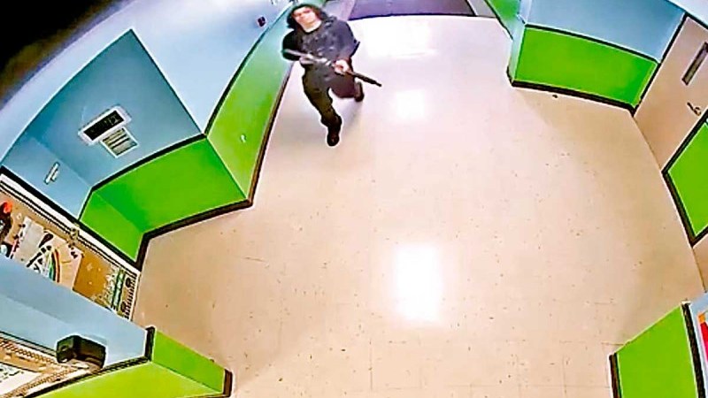 En las imágenes, se observa el ingreso del atacante, Salvador Ramos, vestido de negro y portando un rifle. En el pasillo vacío, se aprecia otro estudiante (cuya imagen aparece difuminada) que ve al agresor y corre en dirección contraria.