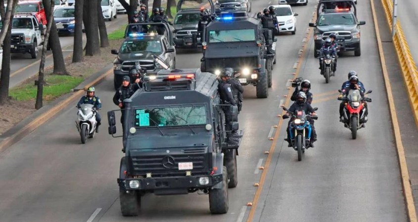 “El Rinoceronte”, que es la unidad principal va resguardada a sus laterales por los elementos de la Policía Bancaria Industrial y a las afueras de la formación elementos de la Fuerza de Tarea (Zorros).