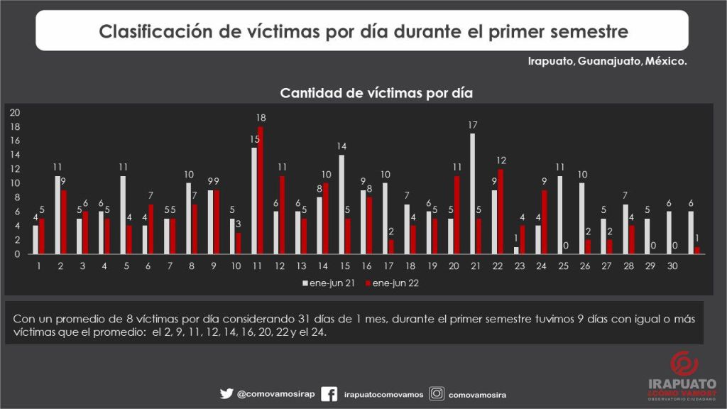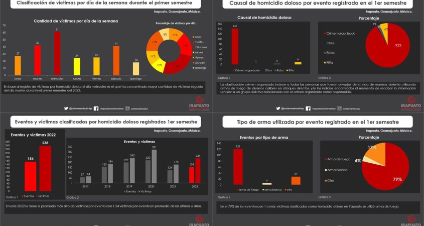 Durante el primes semestre del 2022 se registró en Irapuato un total de 154 eventos clasificados como homicidio doloso, esto significó un aumento del 24%. En cuanto a víctimas sabiendo que cada evento puede contar más de 1 víctima, se registró un total de 238 personas fallecidas, que significó un aumento en comparación con el primer semestre del 2021 de un 33%.